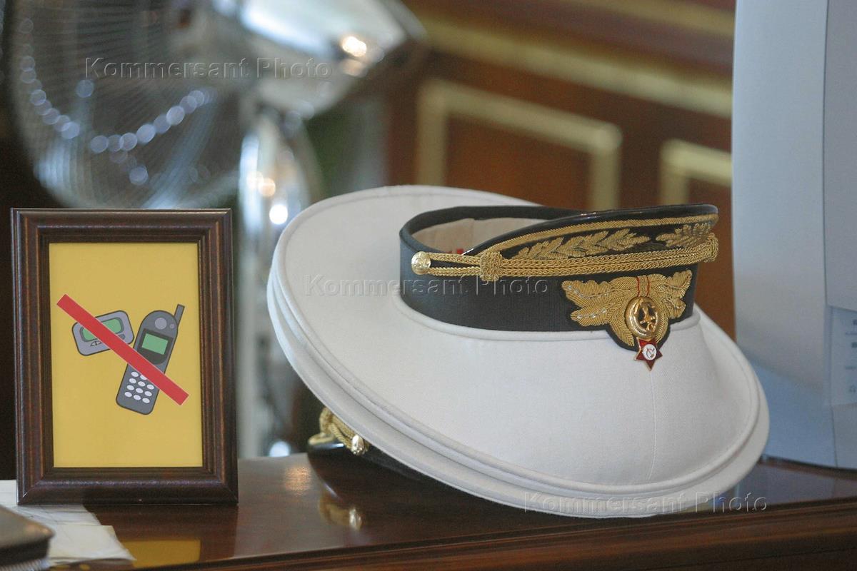 Russian navy officer's peaked cap and a tablet forbidding usage of mobile phones and pagers.