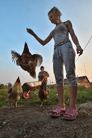 Жанровая фотография. Девушка и мужчина с гусями в загоне.