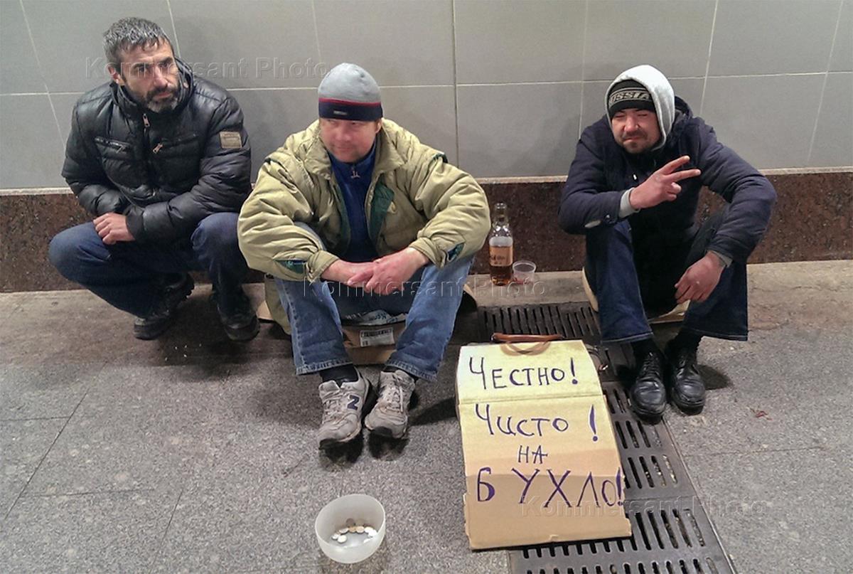 Жанровая фотография. Мужчины попрашайки на улице с табличкой "Честно! Чисто на бухло!".