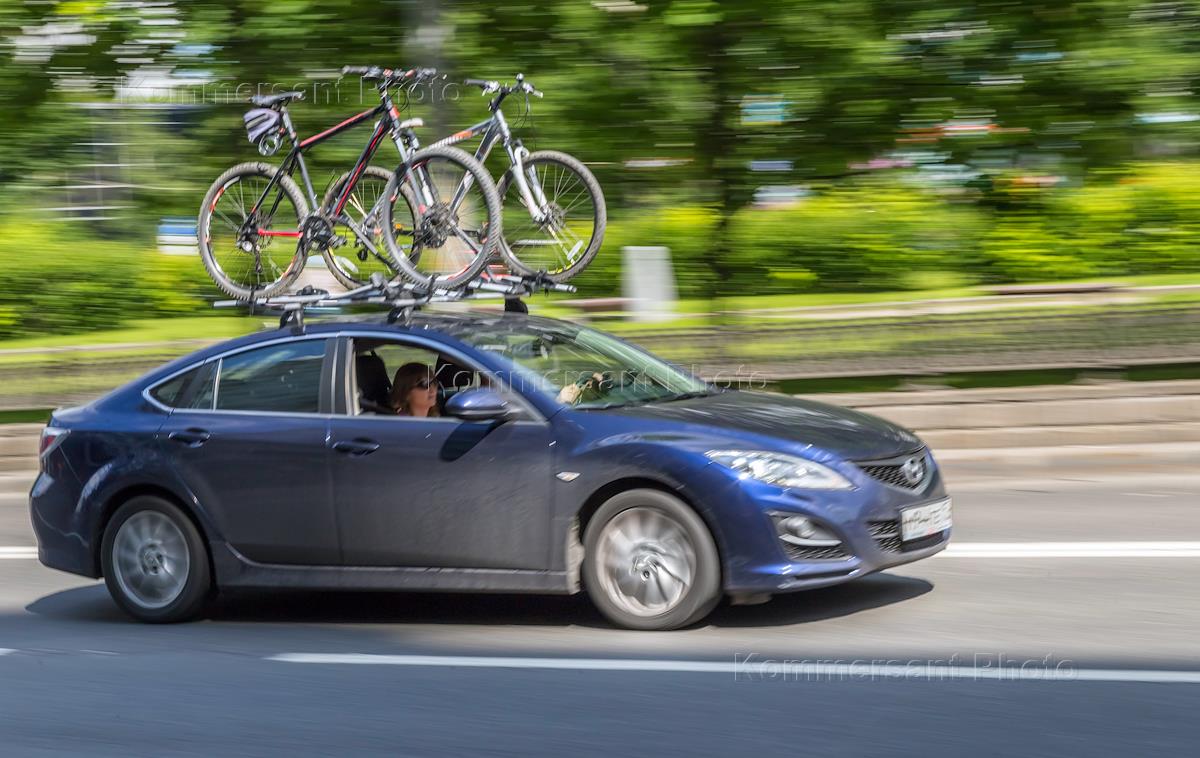 Genre photo. Mazda 3 riding with bicycles on the roof rack.