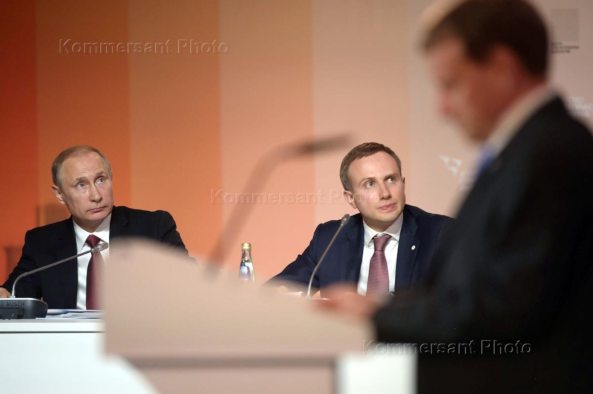 Генеральный директор Агентства стратегических инициатив по продвижению новых проектов (АСИ) Андрей Никитин (слева) и президент России Владимир Путин (cправа) во время заседания расширенного Экспертного совета Агентства стратегических инициатив на ВДНХ.