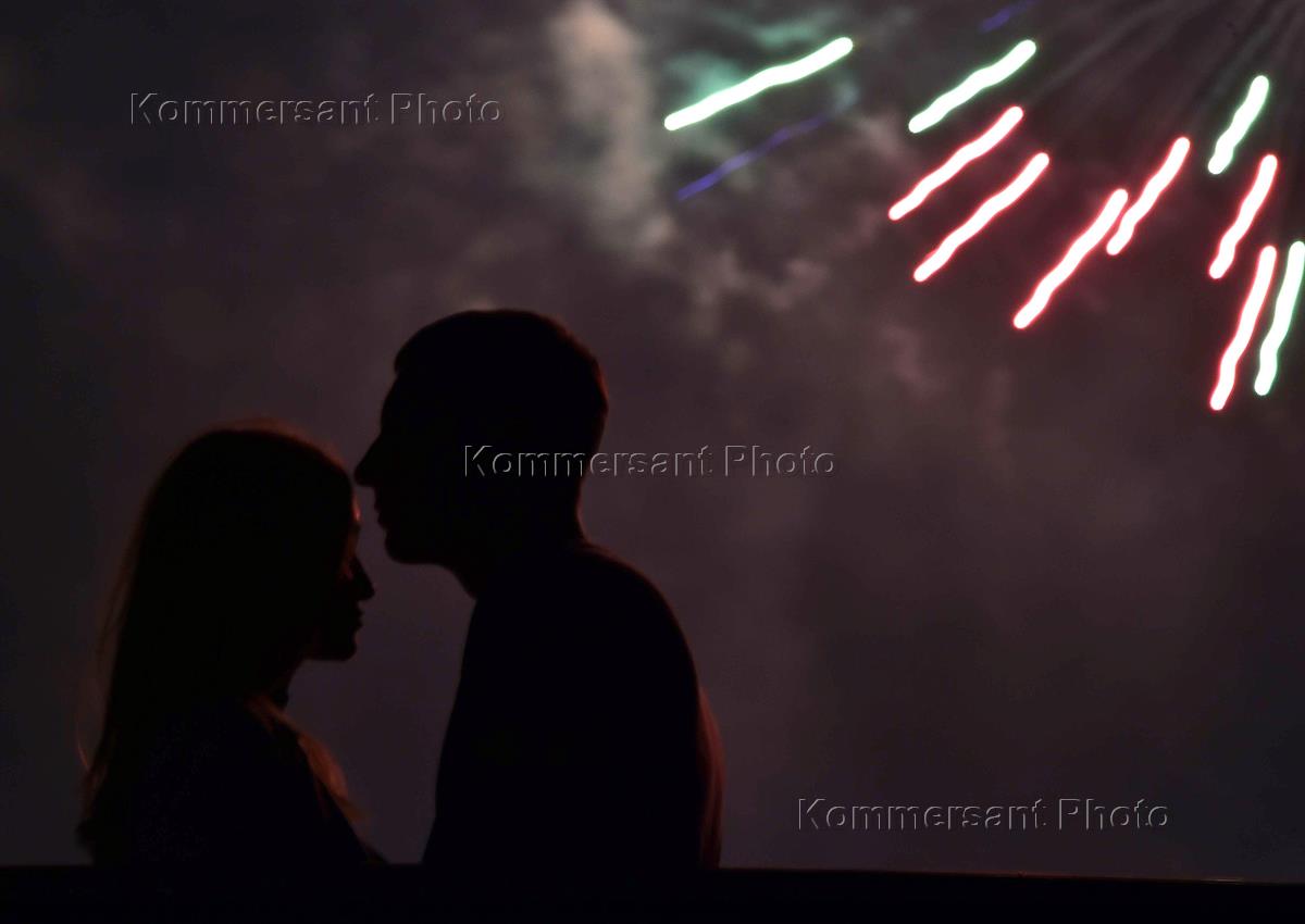 II Международный фестиваль фейерверков "Ростех" прошел в Братеевском каскадном парке. Девушки во время сэлфи на фоне фейерверков.