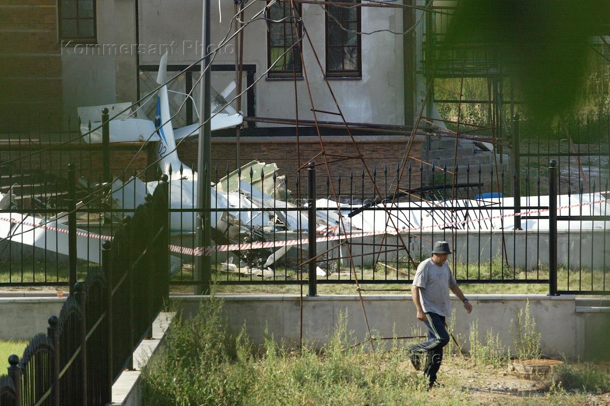 Debris of the hydroplane 'Corvet' which ran into a metal beam at a country-house construction site outside Moscow and crashed on the ground. The pilot, one passenger, and a construction worker died in the incident.