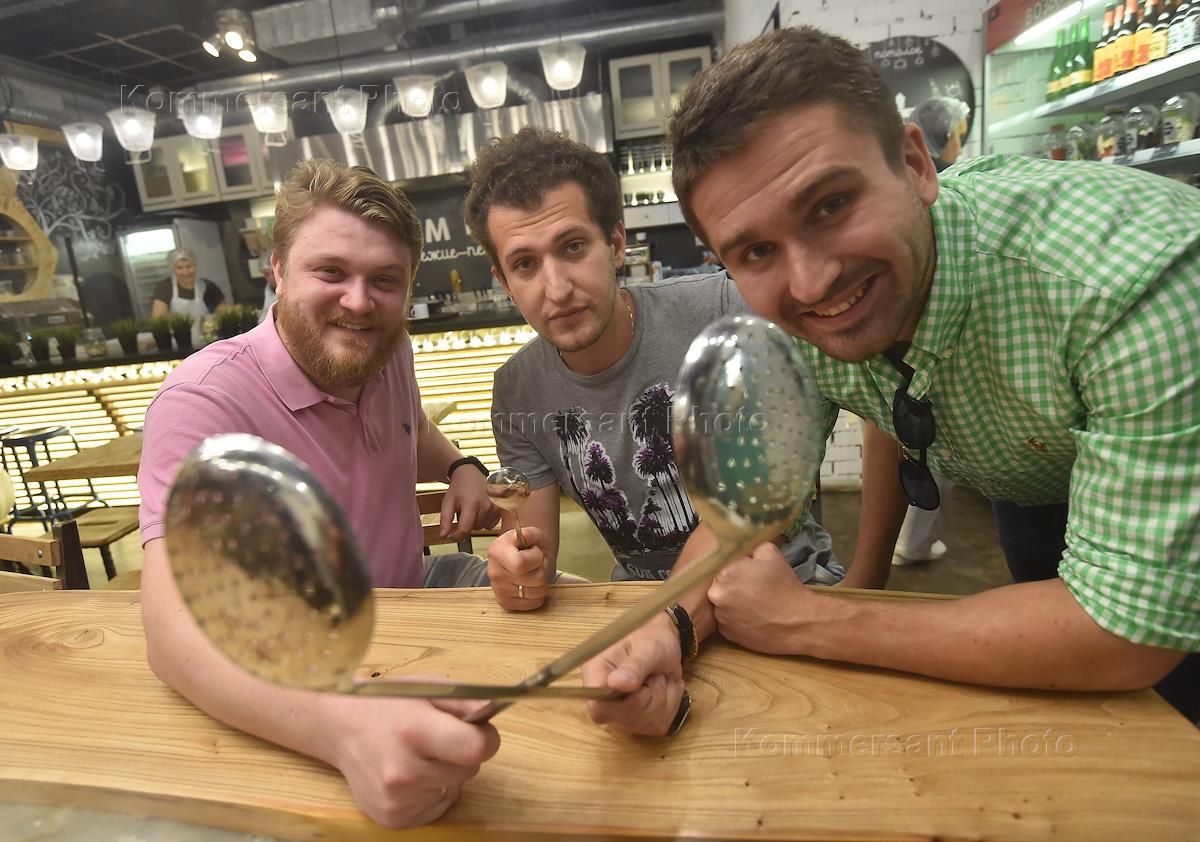 Слева направо: совладельцы пельменной "Лепим и варим" Михаил Фишер, Николай Рихтер, основатель и совладелец пельменной "Лепим и варим" Николай Сердотецкий в зале кафе.
