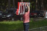 Жанровая фотография. Мужчина несет стенд с цифрами.