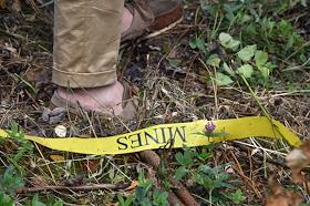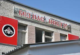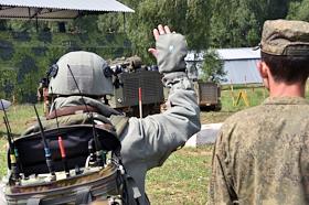 Демонстрация вариантов приемов разминирования и работ на пожаре роботов-саперов военнослужащами инженерной бригады СЗВО прошла на полигоне. Плакат на здании с надписью "Без нас-никто!".