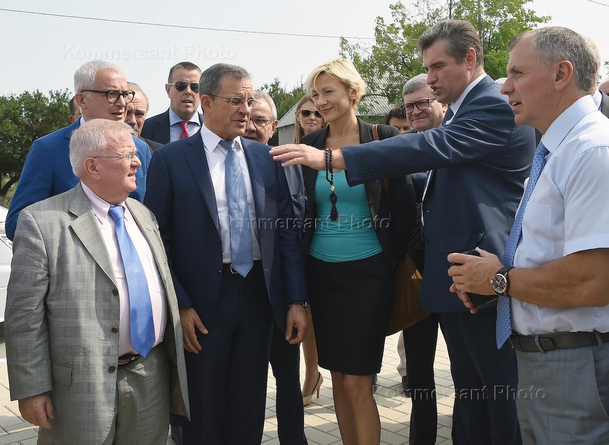 Визит французских парламентариев во главе с депутатом Национального собрания, бывшим министром транспорта Франции Тьерри Мариани в Крым. Слева на право: председатель комитета Государственной думы (ГД) России по делам Содружества Независимых Государств (СНГ), евразийской интеграции и связям с соотечественниками Леонид Слуцкий, депутат Национального Собрания Французской Республики, сопредседатель Ассоциации Франко-российский диалог Тьерри Мариани и председатель Государственного совета Республики Крым Владимир Константинов во время посещения Мемориального комплекса жертвам фашистской оккупации Крыма "Концлагерь "Красный" в поселке Мирное Симферопольского района.