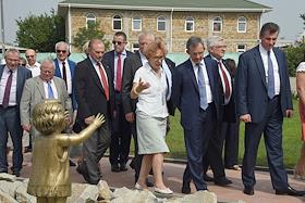 Визит французских парламентариев во главе с депутатом Национального собрания, бывшим министром транспорта Франции Тьерри Мариани в Крым. Председатель Государственного совета Республики Крым Владимир Константинов (слева), депутат Национального собрания Франции Жак Мияр (второй слева), депутат Национального собрания Франции, сопредседатель Ассоциации Франко-российский диалог Тьерри Мариани (третий слева), глава делегации Франции в Парламентской ассамблее ОБСЕ Мишель Вуазен (третий справа) и председатель комитета Государственной думы (ГД) России по делам Содружества Независимых Государств (СНГ), евразийской интеграции и связям с соотечественниками Леонид Слуцкий (второй справа) во время посещения Мемориального комплекса жертвам фашистской оккупации Крыма "Концлагерь "Красный" в поселке Мирное Симферопольского района.