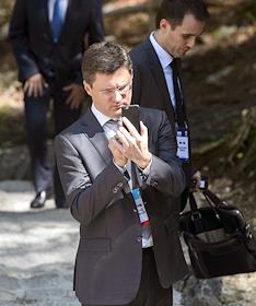 Рабочая поездка президента России Владимира Путина в Словению. Министр энергетики России Александр Новак перед началом мемориальной церемонии по случаю 100-летия возведения у перевала Вршич русской часовни в память о российских воинах, погибших в этих местах в годы Первой мировой войны.