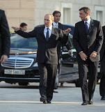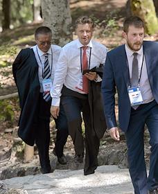 Рабочая поездка президента России Владимира Путина в Словению. Министр энергетики России Александр Новак (слева) и министр экономического развития России Алексей Улюкаев (справа) перед началом мемориальной церемонии по случаю 100-летия возведения у перевала Вршич русской часовни в память о российских воинах, погибших в этих местах в годы Первой мировой войны.