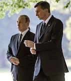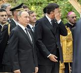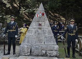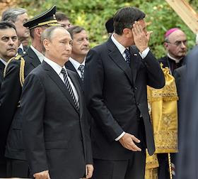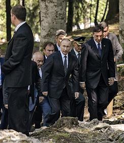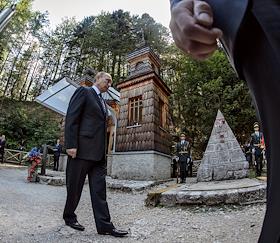 Рабочая поездка президента России Владимира Путина в Словению. Президент России Владимир Путин (справа) во время участия в мемориальной церемонии по случаю 100-летия возведения у перевала Вршич русской часовни в память о российских воинах, погибших в этих местах в годы Первой мировой войны.