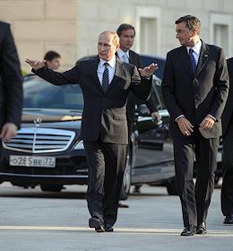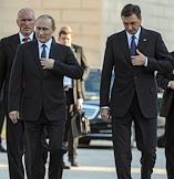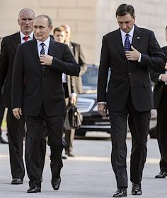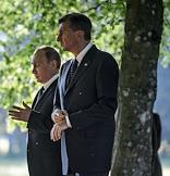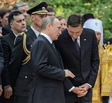 Рабочая поездка президента России Владимира Путина в Словению. Президент России Владимир Путин (слева) и президент Словении Борут Пахор (справа) после участия в мемориальной церемонии по случаю 100-летия возведения у перевала Вршич русской часовни в память о российских воинах, погибших в этих местах в годы Первой мировой войны.