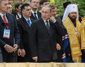 Рабочая поездка президента России Владимира Путина в Словению. Заместитель руководителя администрации президента России, пресс-секретарь президента Дмитрий Песков (слева), президент России Владимир Путин (в центре) и председатель Отдела внешних церковных связей Московского Патриархата архиепископ Волоколамский Иларион (справа) во время участия в мемориальной церемонии по случаю 100-летия возведения у перевала Вршич русской часовни в память о российских воинах, погибших в этих местах в годы Первой мировой войны.