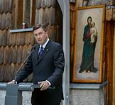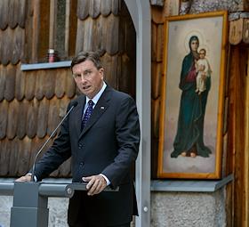 Рабочая поездка президента России Владимира Путина в Словению. Президент Словении Борут Пахор во время участия в мемориальной церемонии по случаю 100-летия возведения у перевала Вршич русской часовни в память о российских воинах, погибших в этих местах в годы Первой мировой войны.