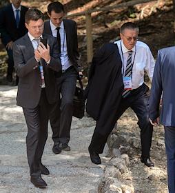 Рабочая поездка президента России Владимира Путина в Словению. Министр экономического развития России Алексей Улюкаев (слева) и министр транспорта России Максим Соколов (в центре) перед началом мемориальной церемонии по случаю 100-летия возведения у перевала Вршич русской часовни в память о российских воинах, погибших в этих местах в годы Первой мировой войны.