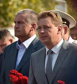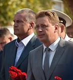 The day of the Russian Navy. Head of the Republic of Crimea, chairman of the Council of Ministers of the Republic of Crimea Sergey Aksenov (left) and acting governor of Sevastopol Dmitry Ovsyannikov (right) are during the festive events of the Russian Navy Day in Sevastopol.