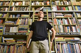 Фотопроект о детях августа 1991. Выпускник факультета социальных наук РГПУ имени А.Герцена Дмитрий Николюк перед книжным стеллажом магазина "Подписные издания"