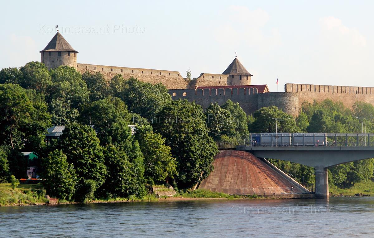 Государственная граница России с Эстонией и Евросоюзом. Ивангородская средневековая крепость. Пограничная река Нарва.