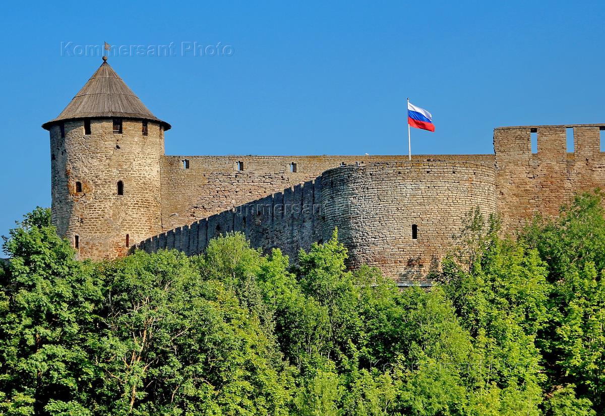 Государственная граница России с Эстонией и Евросоюзом. Ивангородская средневековая крепость. Флаг России.