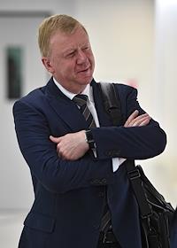 Председатель правления ОАО «Роснано» Анатолий Чубайс перед совещанием "О перспективах развития отечественной микроэлектронной промышленности". Совещание прошло на заводе по производству микроэлектроники АО "Ангстрем-Т".