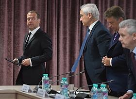 Председатель правительства России Дмитрий Медведев (в центре) во время совещания "О перспективах развития отечественной микроэлектронной промышленности". Совещание прошло на заводе по производству микроэлектроники АО "Ангстрем-Т".