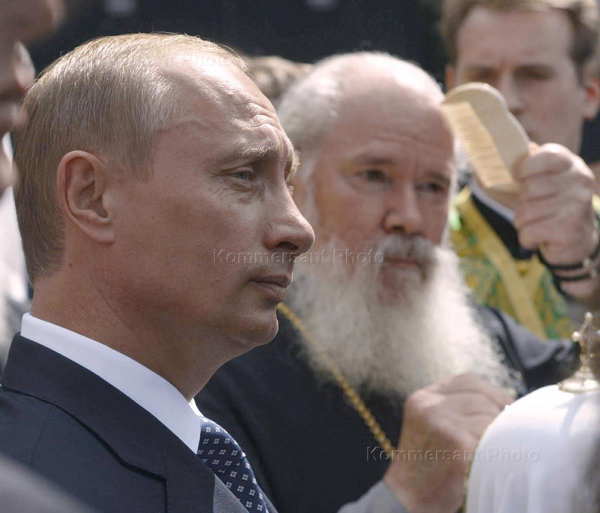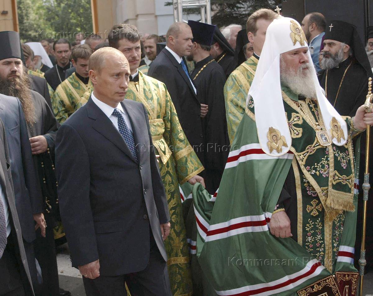 Russian President Vladimir Putin (left) and teh Patriarch of Moscow and Russia Alexii II (right) visited the Blessed Serafim Sarovsky cathedral.