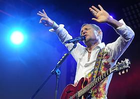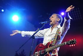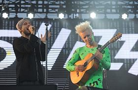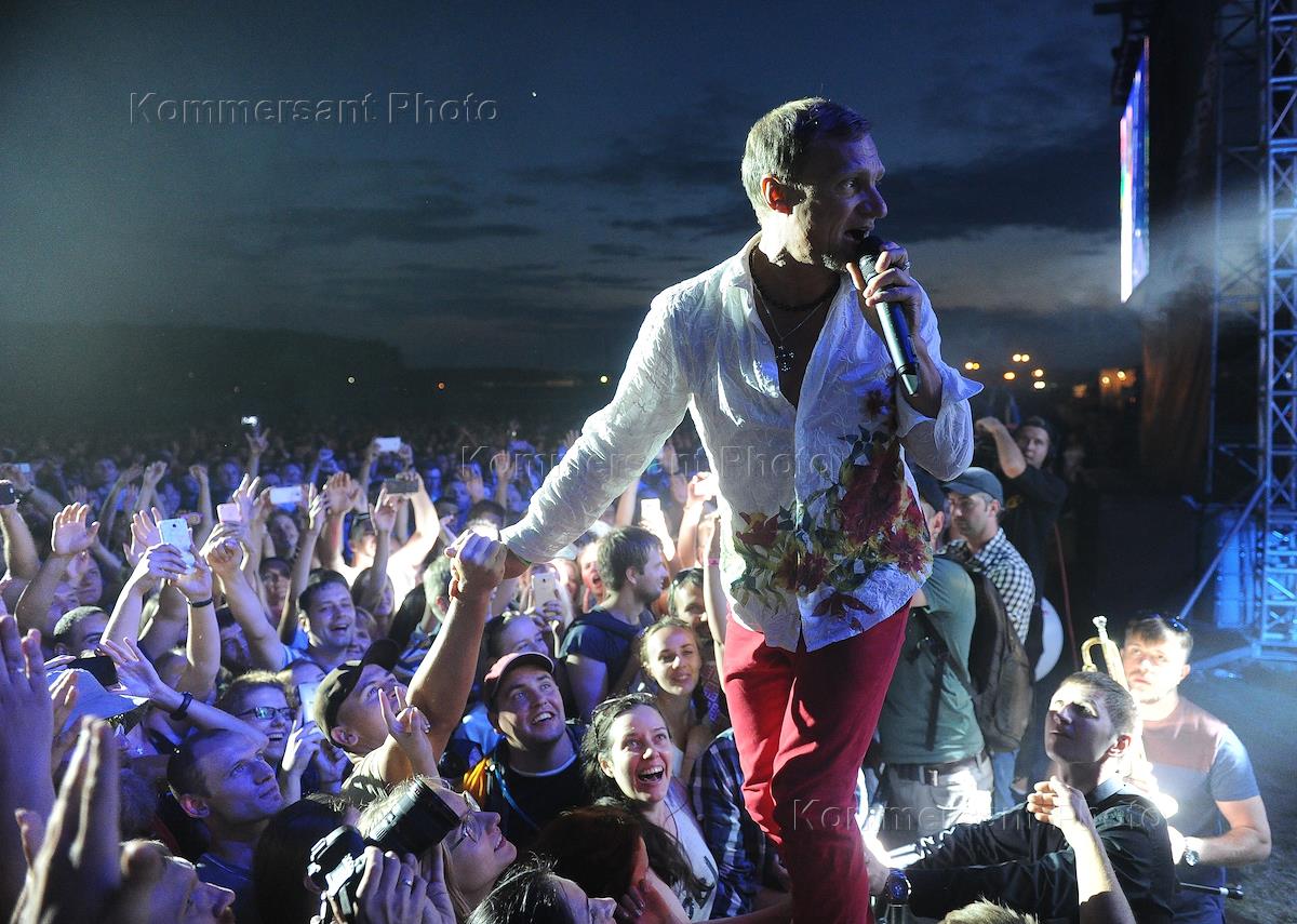 Международный фестиваль "Рок за Бобров" на аэродроме "Боровая". Солист группы "Вопли Видоплясова" ("ВВ") Олег Скрипка во время выступления на фестивале.