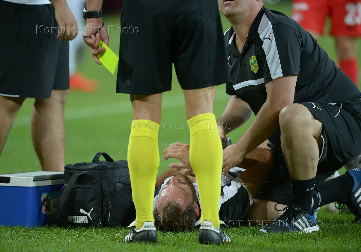 Матч 3-го отборочного раунда Лиги Европы по футдолу между командами "Спартак" (Россия, Москва) и АЕК (Кипр, Ларнака) на стадионе "Открытие арена". Игрок команды "Спартак" Дмитрий Комбаров (слева) и игрок команды "АЕК" Хуанма Ортис (справа) во время матча.