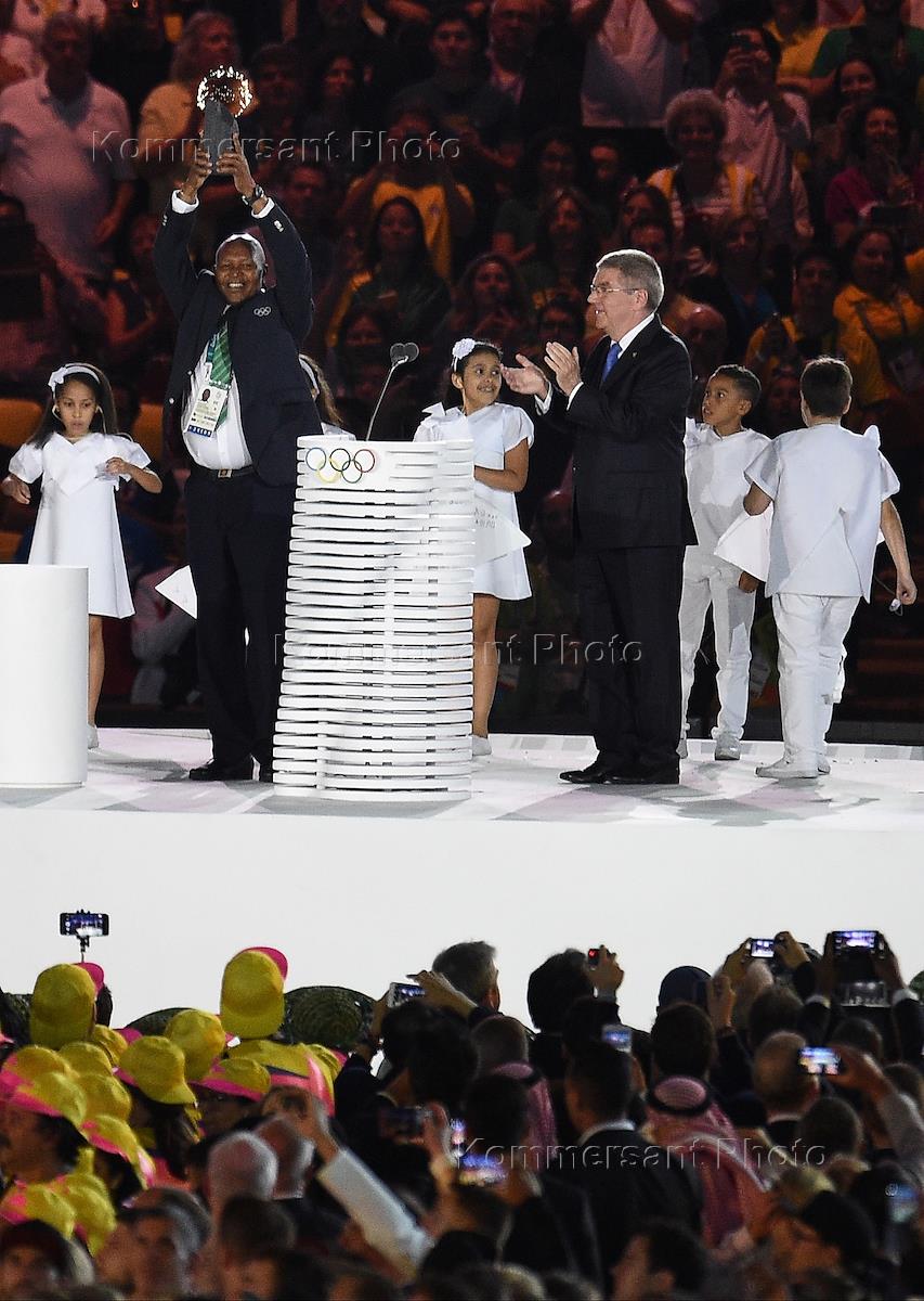 XXXI Летние Олимпийские игры в Рио-де-Жанейро 2016. Торжественная церемония открытия на стадионе "Маракана". Президент Международного олимпийского комитета (МОК) Томас Бах (справа) и двукратный олимпийский чемпион Кипчоге Кейно (слева) со специальной премией МОК за вклад в развитие спорта, во время церемонии.
