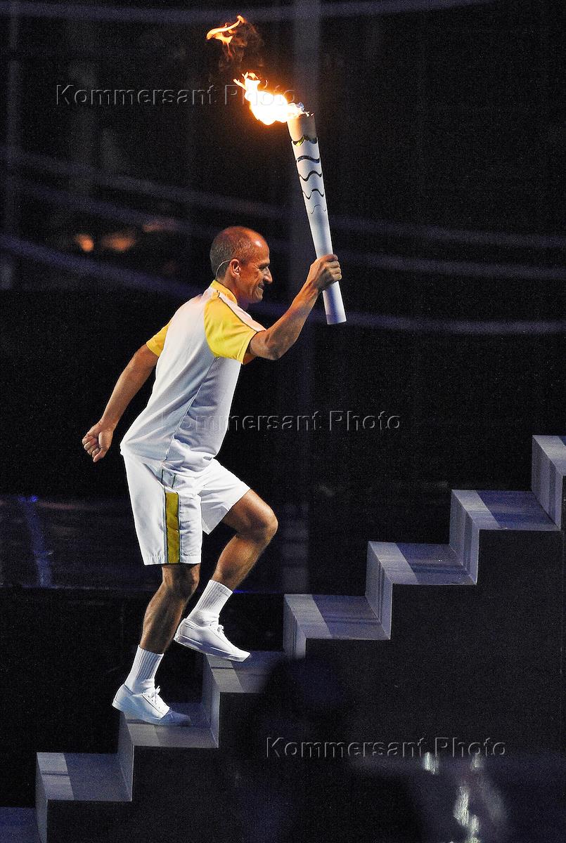 XXXI Летние Олимпийские игры в Рио-де-Жанейро 2016. Торжественная церемония открытия на стадионе "Маракана". Бронзовый призер Олимпийских игр 2004 года в Афинах, бразильский марафонец Вандерлей Кордейру с факелом во время церемонии зажжения Олимпийского огня.
