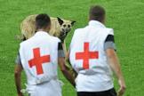 РОСГОССТРАХ - Чемпионат России по футболу. Премьер-лига. 2 тур. Матч между командами "Локомотив" (Москва) и "Томь" (Томск) прошел на стадионе "Локомотив". Жанровая фотография. Бродячая собака на футбольном поле во время матча.