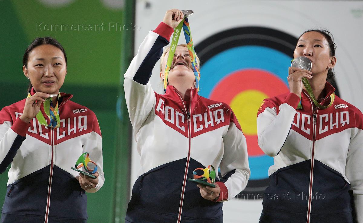 XXXI Летние Олимпийские игры в Рио-де-Жанейро. Слев направо: члены сборной России Туяна Дашидоржиева, Ксения Перова, Инна Степанова, завоевавшие серебряные медали в командном первенстве среди женщин по стрельбе из лука, на церемонии награждения.
