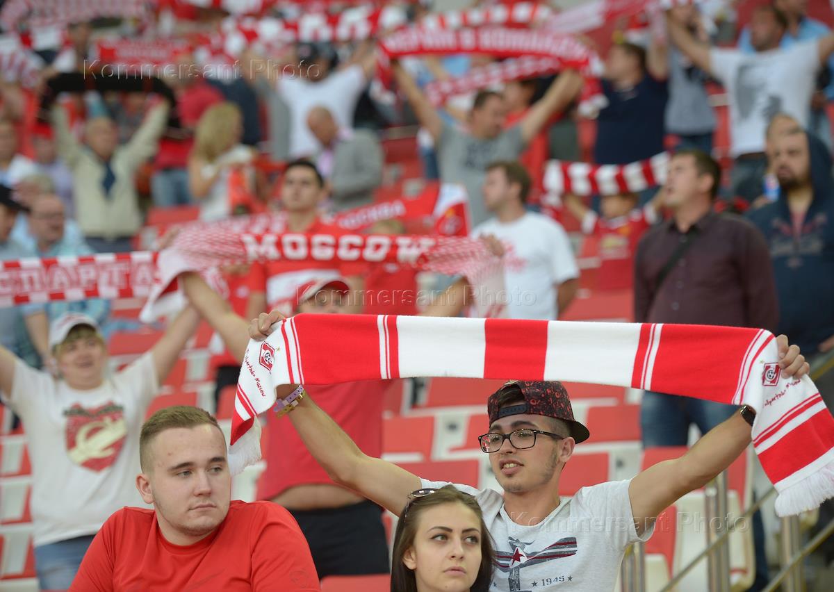 РОСГОССТРАХ - Чемпионат России по футболу. Премьер-лига. 2 тур. Матч между командами "Спартак" (Москва) и "Крылья Советов" (Самара) на стадионе "Открытие Арена". Болельщики команды "Спартак" на трибуне во время матча.
