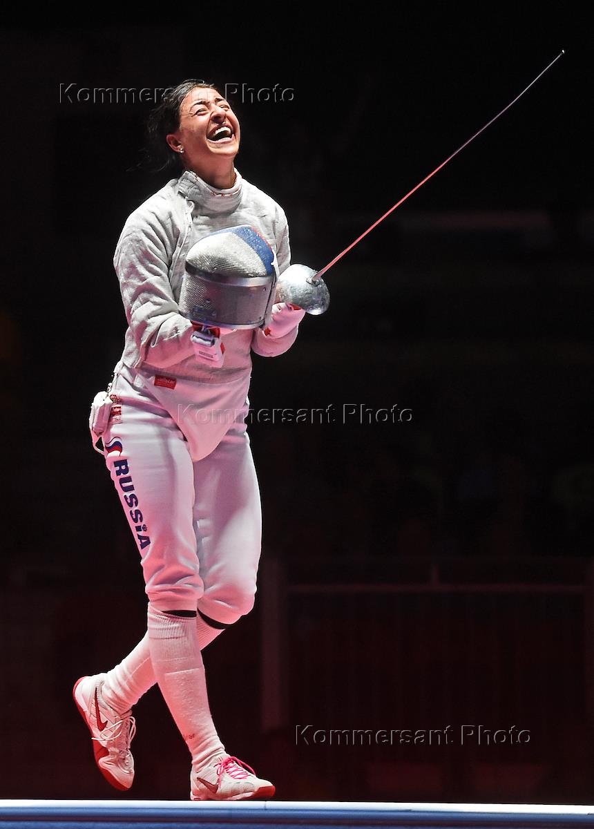 XXXI Летние Олимпийские игры в Рио-де-Жанейро 2016. Первенство по фехтованию на саблях среди женщин. Член олимпийской сборной России по фехтованию Яна Егорян после окончания финала соревнований.