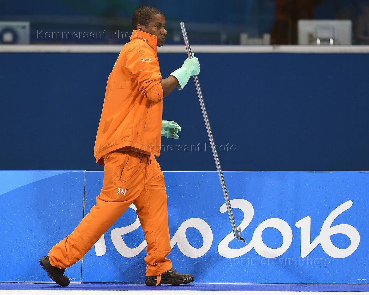 XXXI летние Олимпийские игры в Рио-де-Жанейро. Сотрудник службы по уборке бассейна "Олимпик Акватик Стэдиум" (Olympic Aquatics Stadium) во время подготовки у проведению соревнований по плаванию.