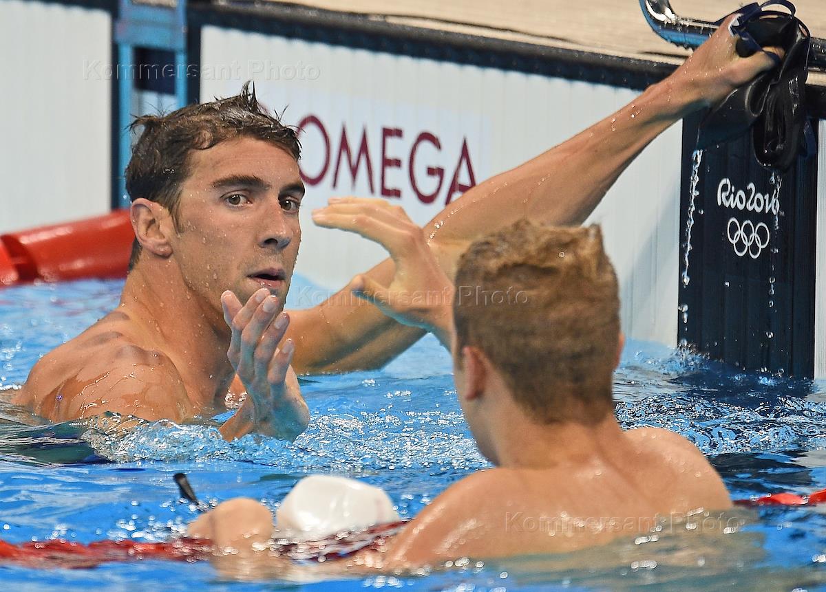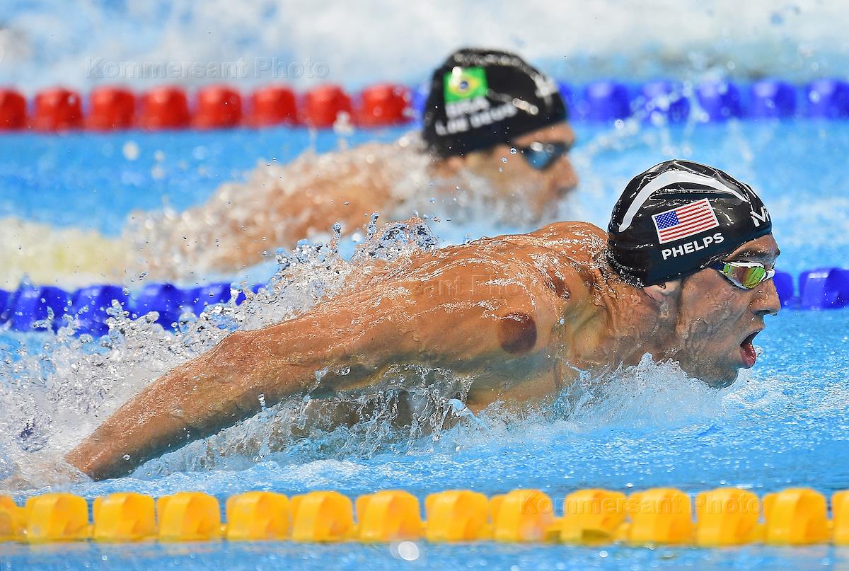 XXXI Летние Олимпийские игры в Рио-де-Жанейро 2016. Полуфинал соревнованиях по плаванию среди мужчин на дистанции 200 м баттерфляем. Член олимпийской сборной команды США по плаванию Майкл Фелпс (слева) во время соревнований.