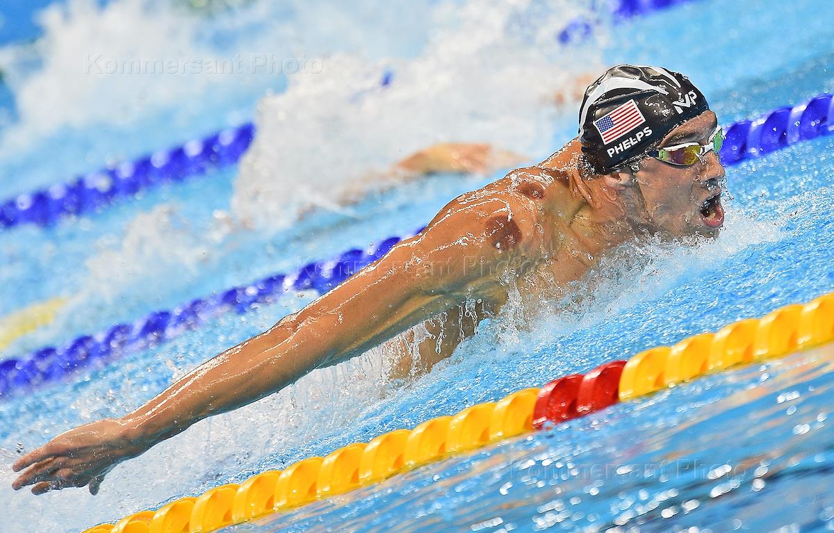 XXXI Летние Олимпийские игры в Рио-де-Жанейро 2016. Полуфинал соревнованиях по плаванию среди мужчин на дистанции 200 м баттерфляем. Член олимпийской сборной команды США по плаванию Майкл Фелпс во время соревнований.