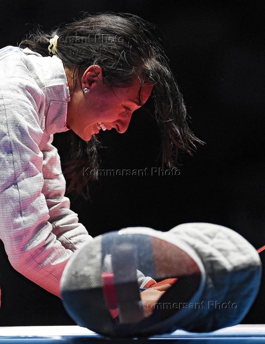 XXXI Летние Олимпийские игры в Рио-де-Жанейро 2016. Первенство по фехтованию на саблях среди женщин. Член олимпийской сборной России по фехтованию Яна Егорян после окончания финала соревнований.