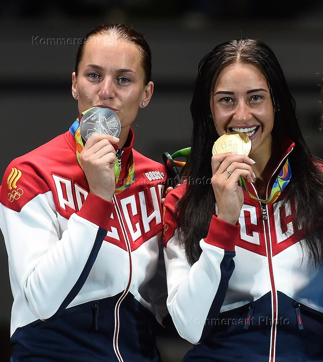 XXXI Летние Олимпийские игры в Рио-де-Жанейро 2016. Первенство по фехтованию на саблях среди женщин. Члены олимпийской сборной России по фехтованию Софья Великая (слева) и Яна Егорян (справа) во время церемонии награждения.