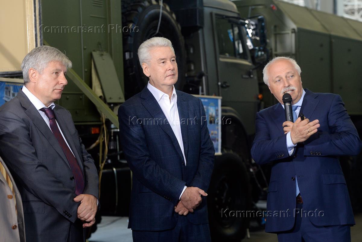 Мэр Москвы Сергей Собянин (в центре), генеральный директор "Алмаз-Антей" Дмитрий Савицкий (слева) и генеральный директор "Лианозовский электромеханический завод" (ЛЭМЗ) Геннадий Бендеровский (справа) во время посещения ЛМЭЗ.
