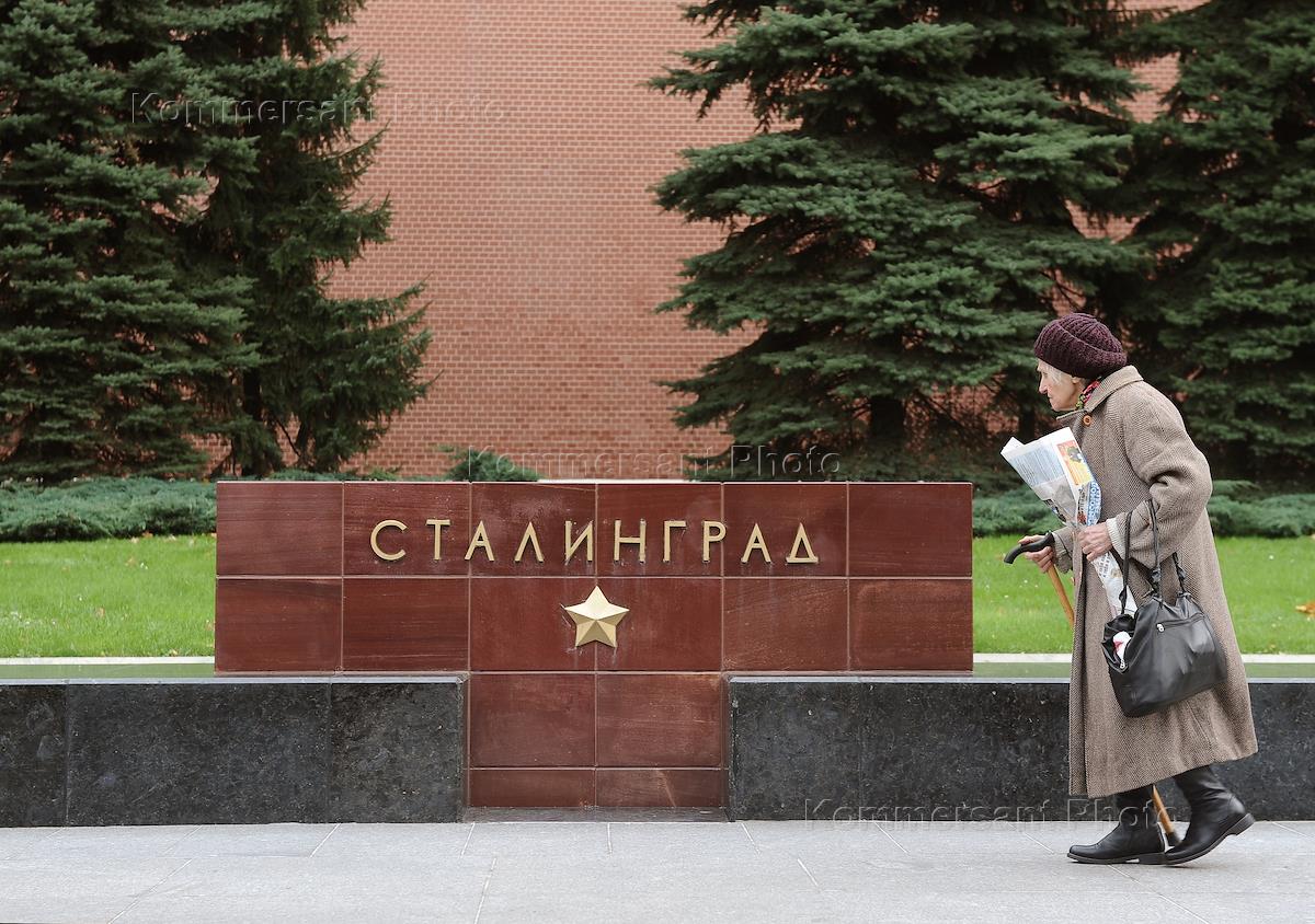 An elderly woman passes by the monument dedicated to Hero-City Stalingrad in the alley of hero-cities in Moscow's Alexander Garden.