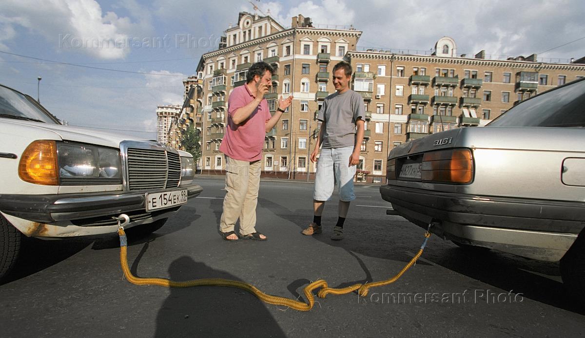 A couple of motorists discuss the problems of tugging a damaged car across the city.