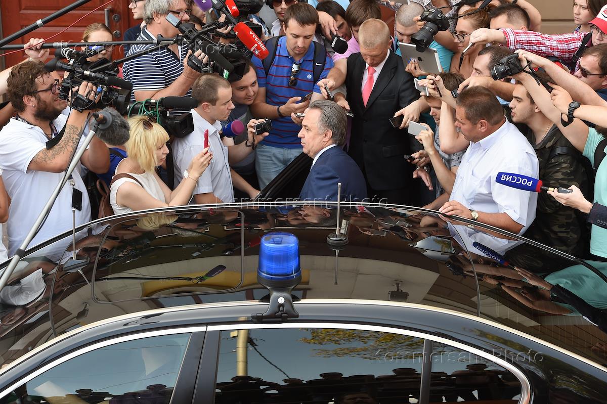 Министр спорта России Виталий Мутко (в центре) после пресс-конференции по итогам заседания исполнительного комитета Российского футбольного союза (РТС), в "Доме футбола" на Таганке.