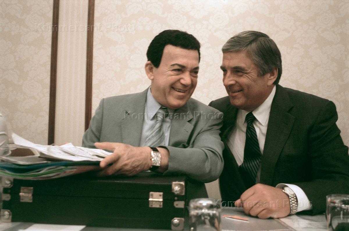 Vice chairman of the State Duma Culture and Tourism Committee Iosif Kobzon (left) and state secretary of the Union of Russia and Belorussia Pavel Borodin (right take part in a meeting of the Eurasian Forum, held in the Aerostar Hotel.
