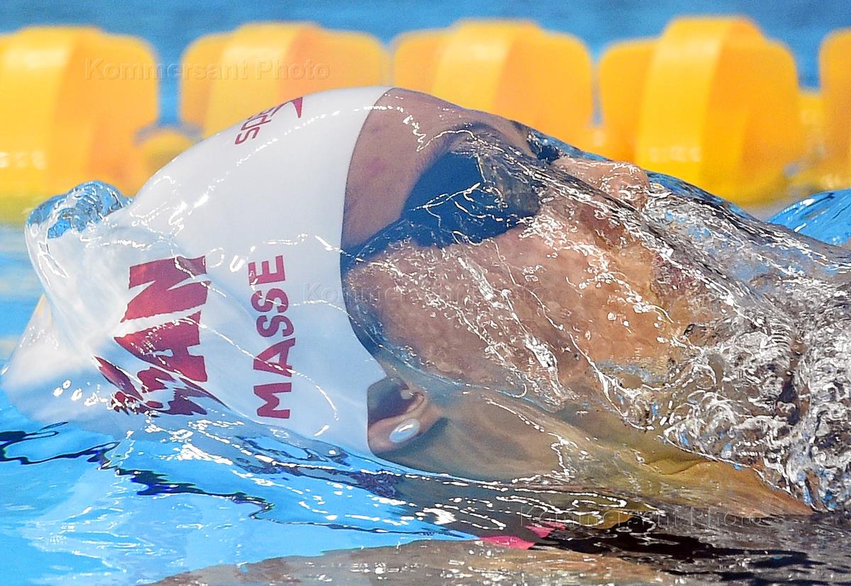 XXXI летние Олимпийские игры в Рио-де-Жанейро. Соревнования по плаванию в комбинированной эстафете 4х100 м среди женщин. Член сборной Канады Кайли Масс во время соревнований.