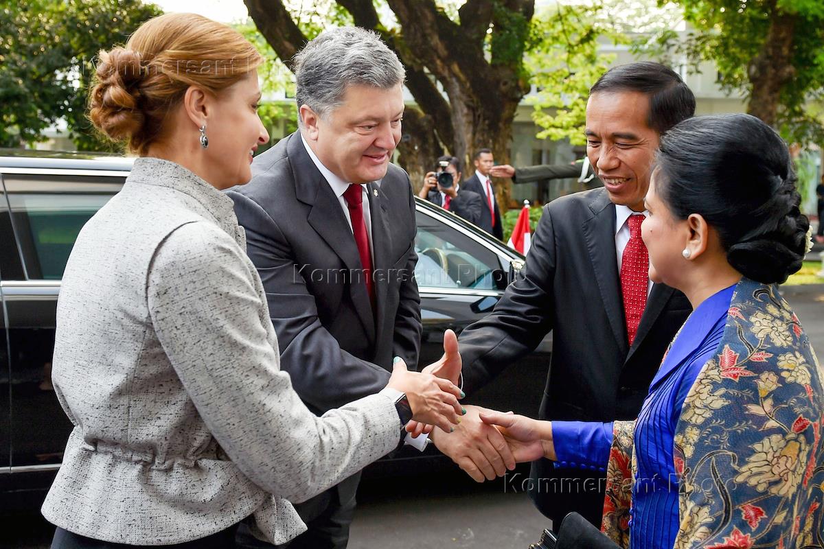 Государственный визит президента Украины Петра Порошенко в Индонезию. Слева направо: супруга президента Украины Марина Порошенко, президент Украины Петр Порошенко, президент Индонезии Джоко Видодо и супруга президента Индонезии Ириана Джоко Видодо во время официальной церемонии встречи.