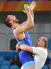 XXXI летние Олимпийские игры в Рио-де-Жанейро. Соревнования по греко-римской борьбе в весовой категории до 85 кг. Член сборной России Давит Чакветадзе после финального поединка.