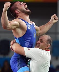 XXXI летние Олимпийские игры в Рио-де-Жанейро. Соревнования по греко-римской борьбе в весовой категории до 85 кг. Член сборной России Давит Чакветадзе (слева) и тренер Левани Кезевадзе (справа) после финального поединка.