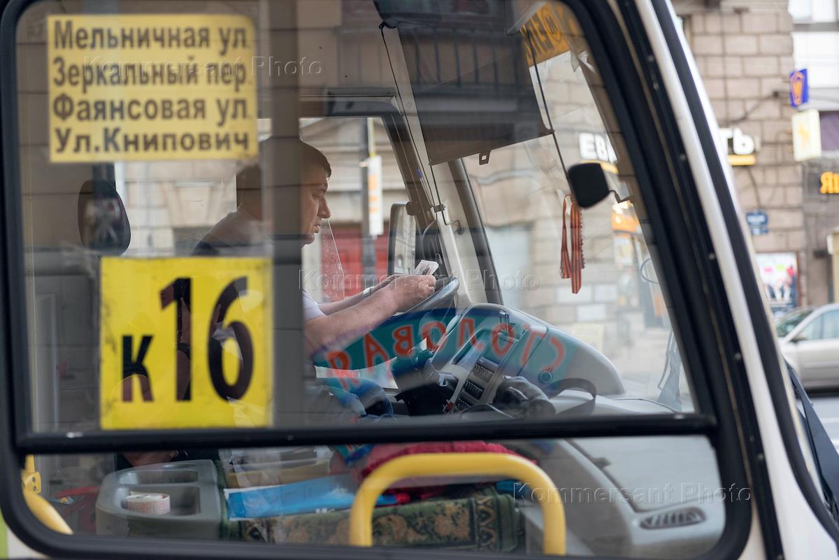 Жанровая фотография. Водитель коммерческого автобуса (маршрутки) пересчитывает деньги в салоне.