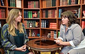 Директор Департамента информационной и региональной политики Министерства образования и науки России Анна Усачева (справа) и журналист Наталья Лучанинова (слева) во время интервью.